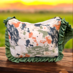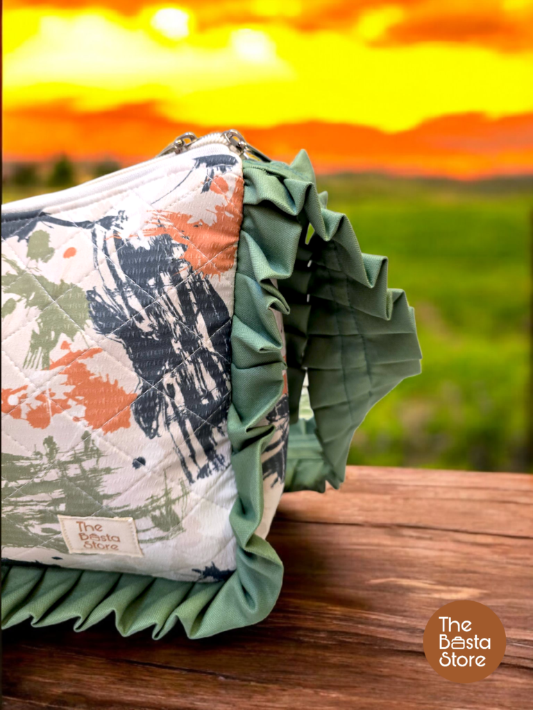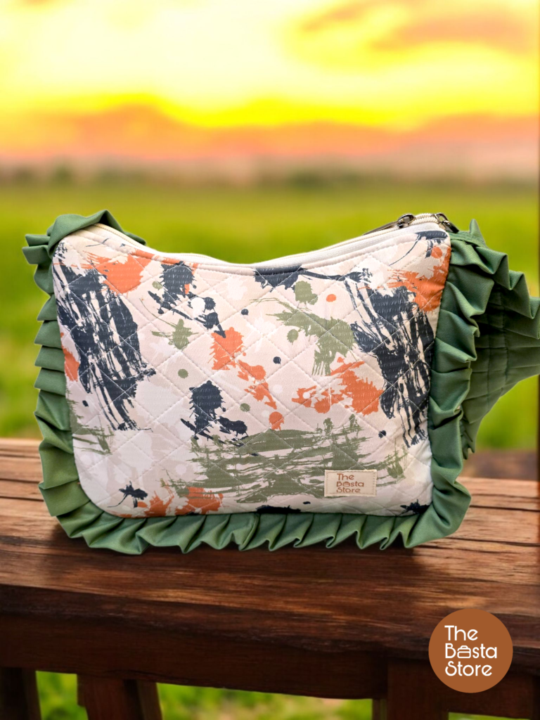 Handmade casual shoulder bag for women with an olive abstract print, quilted cotton fabric, ruffled edges, and non-adjustable ruffled handles.
