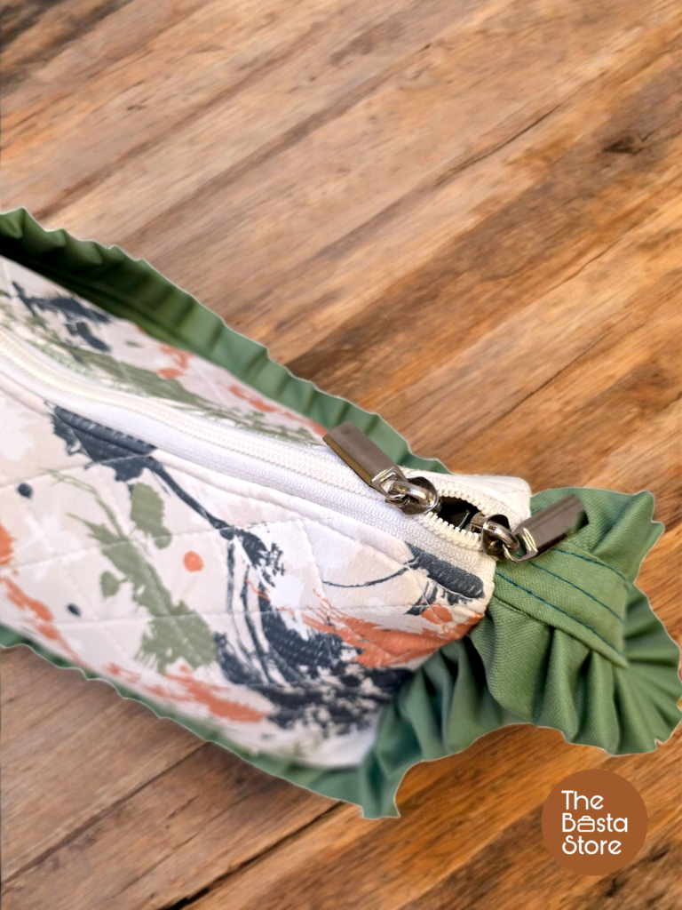 The bag is crafted using quilted cotton fabric, offering soft structure while remaining lightweight. It features ruffled, non-adjustable fabric handles, designed for comfortable shoulder carry. The ruffled edges add a handcrafted finish and give the bag a relaxed, casual look.
