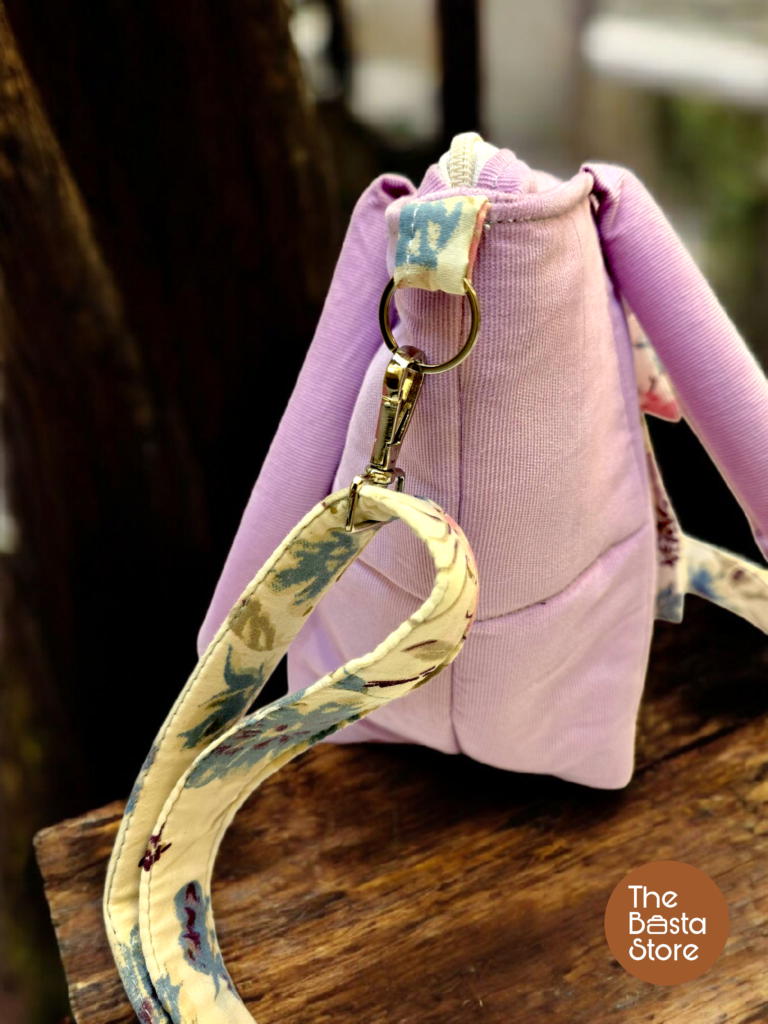 The quilted cotton fabric keeps the bag lightweight and structured. It feels comfortable to carry and does not feel bulky during the day. You can carry it using the short padded handles or wear it crossbody with the detachable and adjustable sling strap.