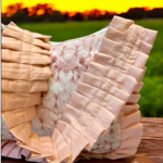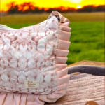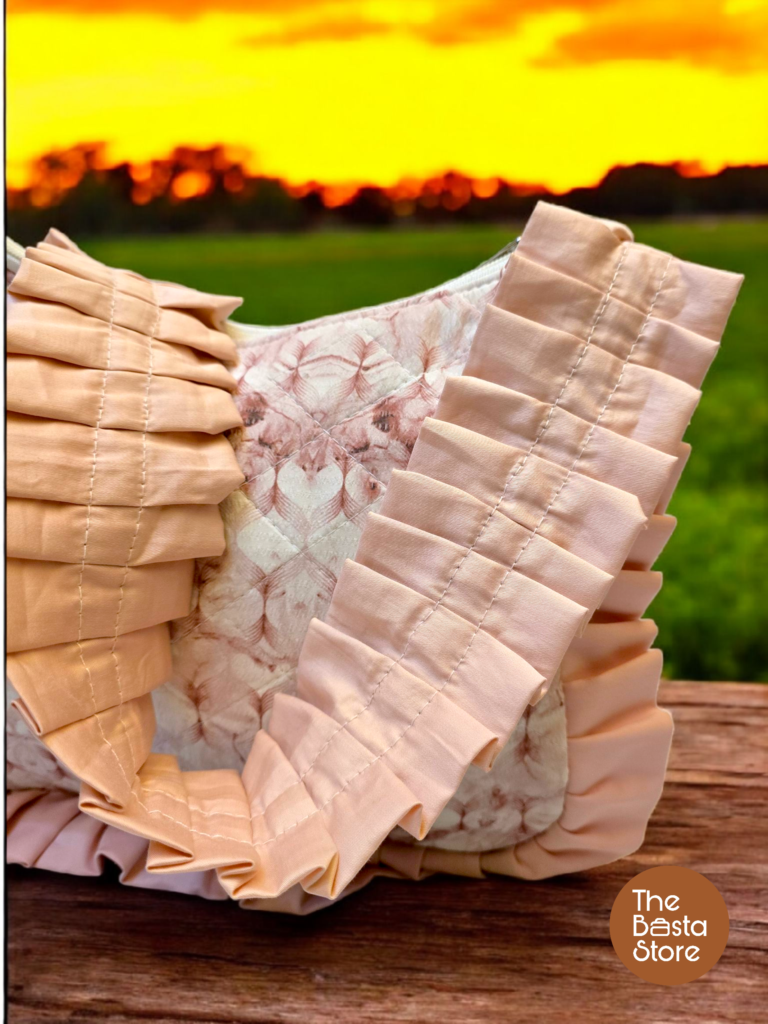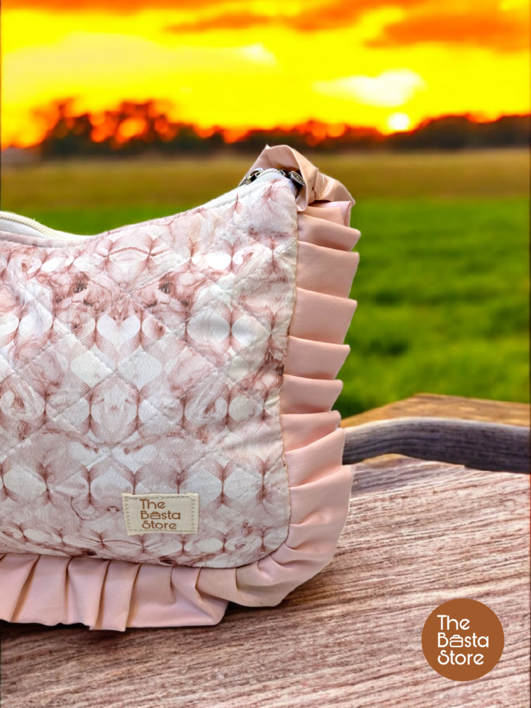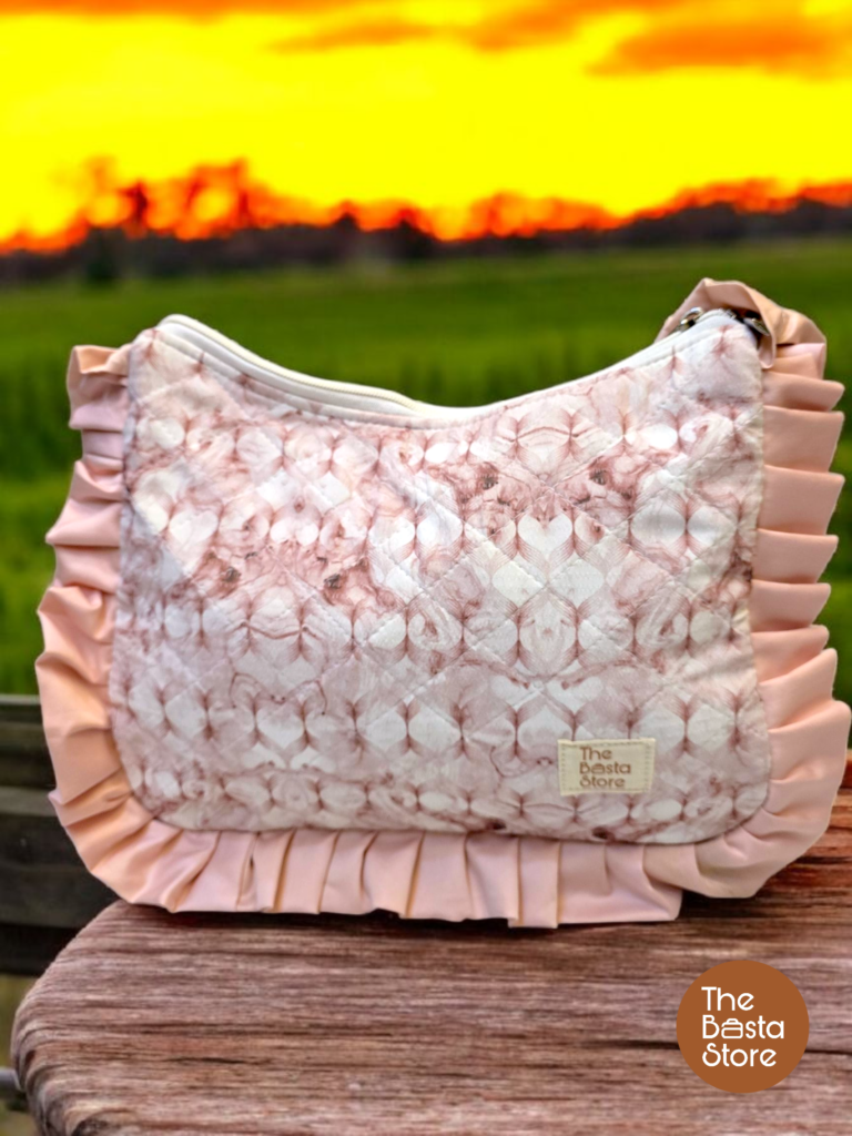 Handmade lightweight shoulder bag with a textured blush print, quilted cotton fabric, ruffled edges, and non-adjustable ruffled handles.
