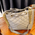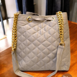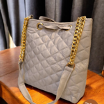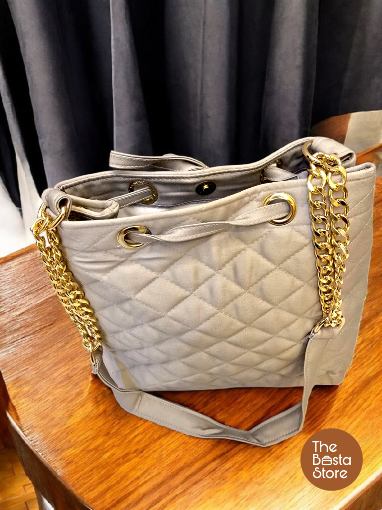 You can wear this bag comfortably as a crossbody using the adjustable chain-and-fabric strap. The drawstring closure at the top keeps your belongings secure while allowing easy opening and closing. Gold-tone hardware adds a subtle contrast to the soft fabric finish.